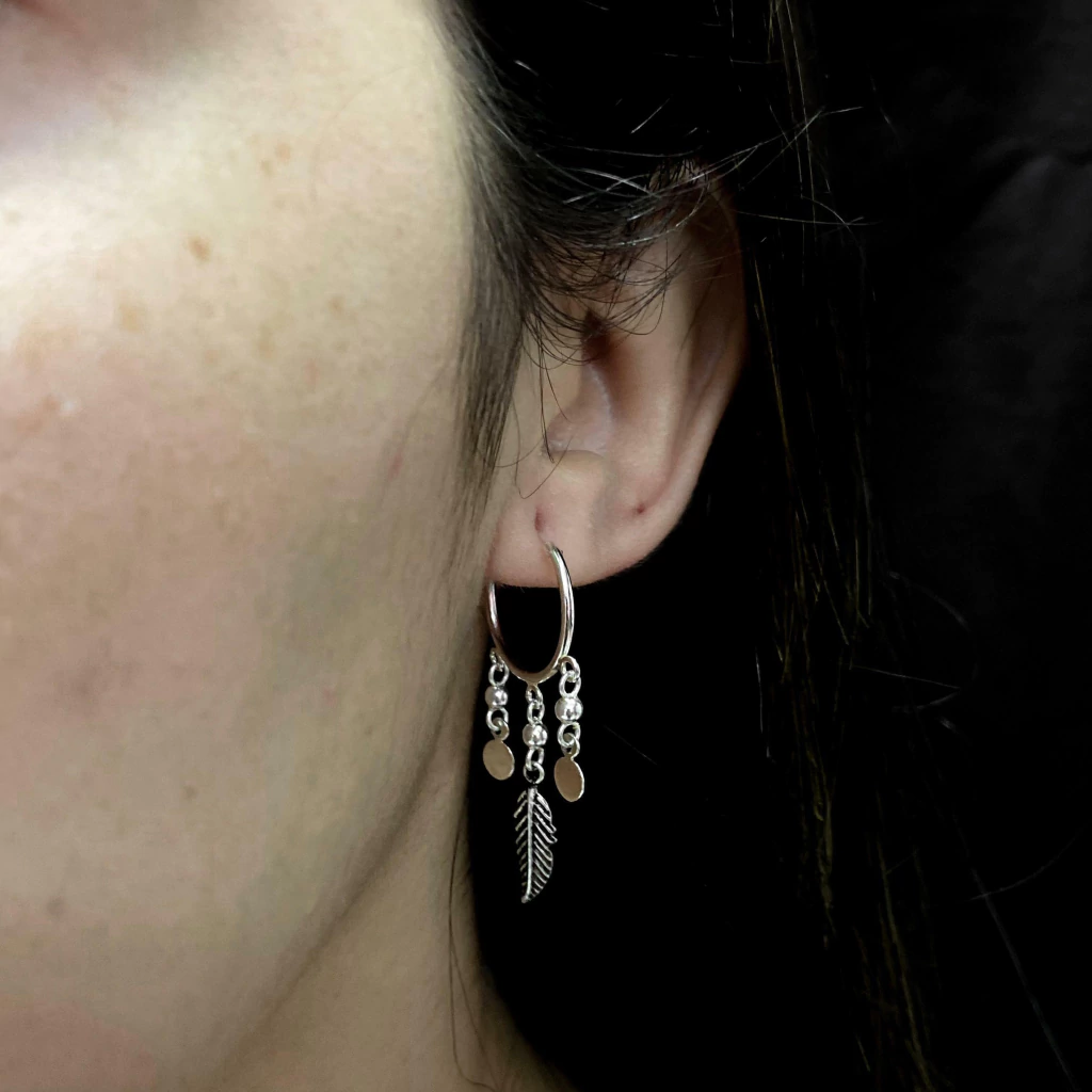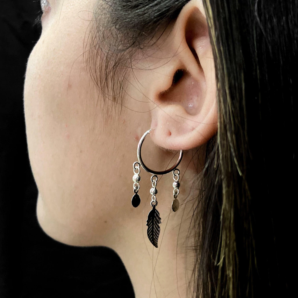Brinco argola 1,6cm bolinhas 2 placas e 1 pena no meio envelhecida em Prata 925, Elegância e Sofisticação em Cada Detalhe