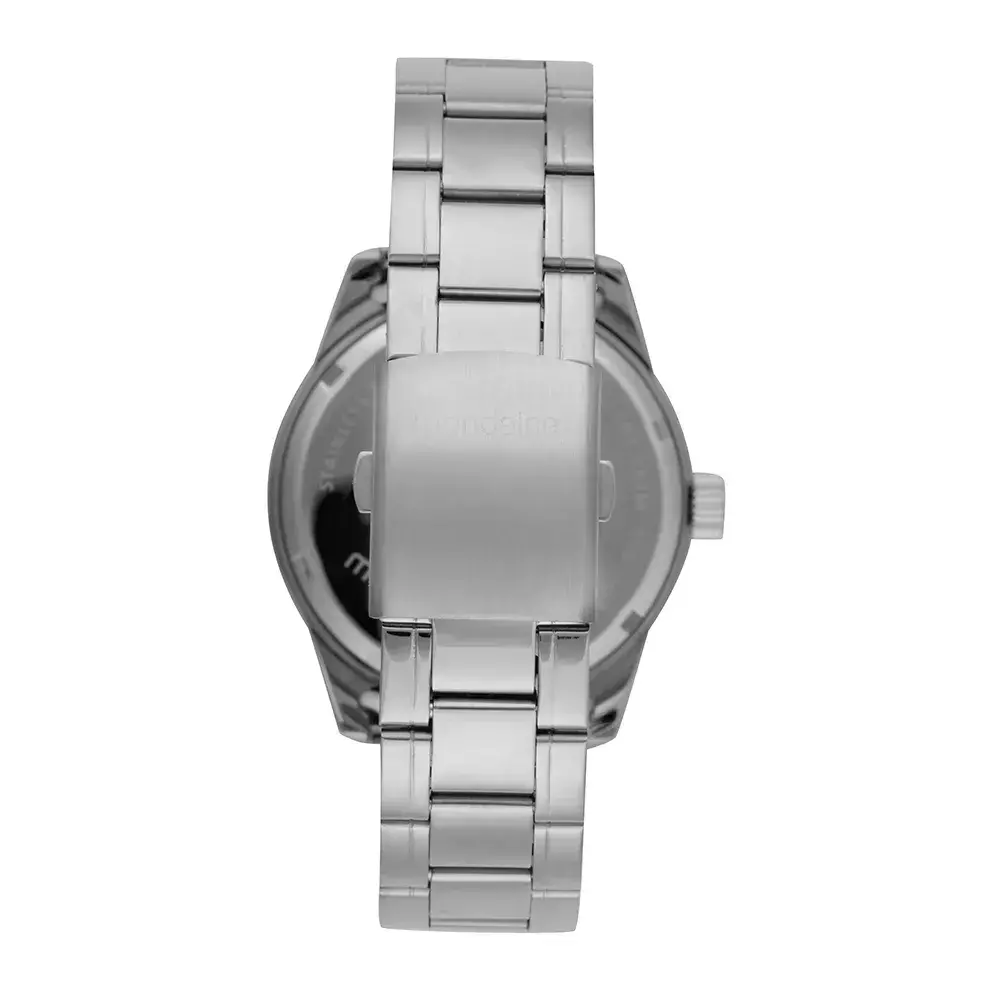 A pulseira de aço prata é durável e confere um visual elegante e versátil. O fecho em aço garante um ajuste seguro no pulso. Este modelo é ideal para o dia a dia, com resistência à água de 5 ATM e fundo de rosca.